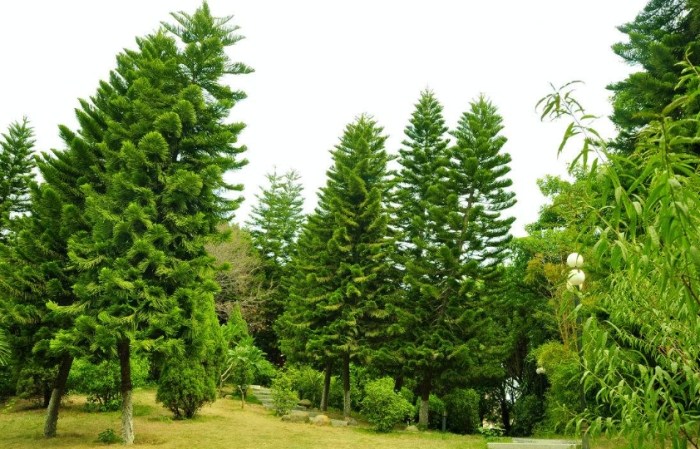 • 南洋杉家族 (Araucaria spp.): 這個在臺灣南部和公園裡常見,尤其是諾福克南洋杉,那種一層層對稱生長的枝條,規整得讓人驚歎,很有熱帶風情。